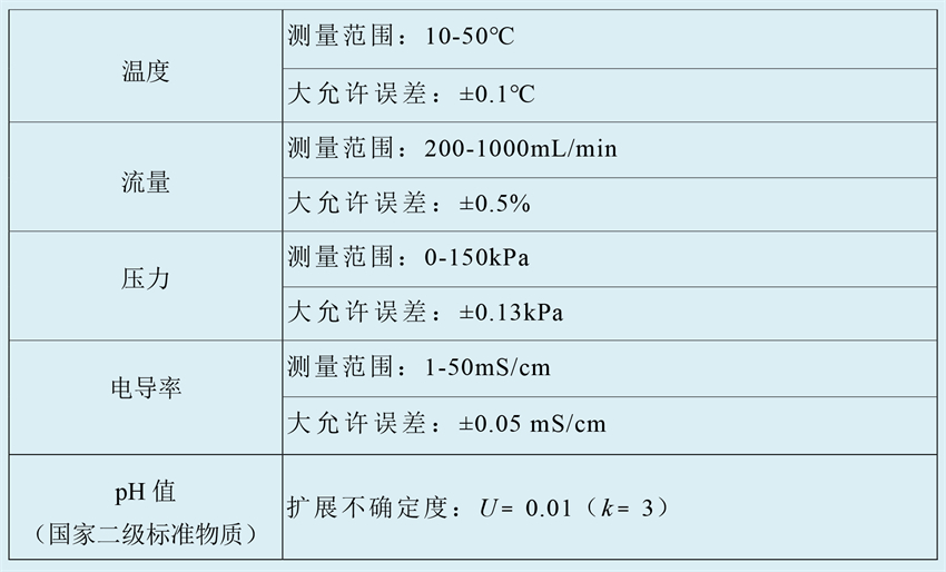 本校準(zhǔn)裝置通過設(shè)計(jì)模擬血液透析裝置檢測儀實(shí)際工作狀態(tài)的液體循環(huán)回路,并在回路中整合用于校準(zhǔn)血液透析裝置檢測儀溫度、流量、壓力、電導(dǎo)率和 pH 值參數(shù)的標(biāo)準(zhǔn)校準(zhǔn)設(shè)備及國家二級標(biāo)準(zhǔn)物質(zhì),實(shí)現(xiàn)了對血液透析裝置檢測儀的溫度、流量、壓力、電導(dǎo)率、pH 值等多參數(shù)一體化校準(zhǔn)。