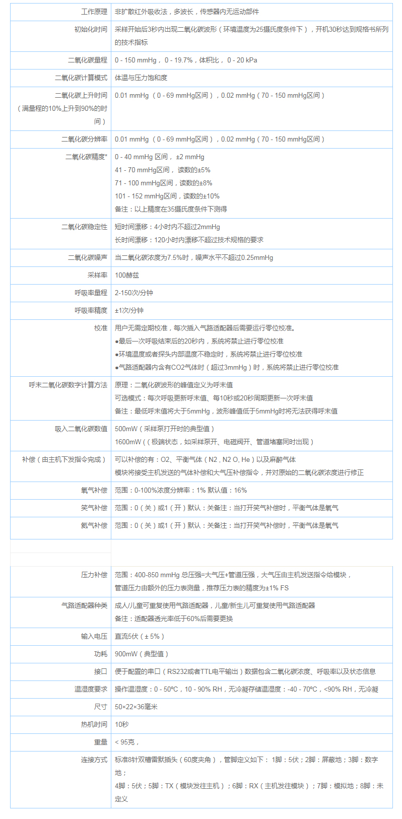 C500型主流CO2模塊通過(guò)精密紅外吸收光譜法測(cè)量人體呼出CO2值。該測(cè)量直接在病人的插管上進(jìn)行,因此模塊響應(yīng)更快,且不會(huì)由于氣路泄露等原因出現(xiàn)錯(cuò)誤的讀數(shù)。病人的氣道分泌物不會(huì)污染到模塊的分析部件,不用替換抽氣泵和其它氣路裝置,因此模塊維修保養(yǎng)所需費(fèi)用和患者所需費(fèi)用都降至低。模塊配套的氣路適配器操作簡(jiǎn)單,雖然這些適配器是一次性的,但它們價(jià)格低廉。該主流CO2模塊C500易于集成,只需在監(jiān)護(hù)儀或麻醉機(jī)上配備一個(gè)8針雷默插座并編寫(xiě)相應(yīng)顯示/控制軟件,就可以使您的病人監(jiān)護(hù)系統(tǒng)配置上先進(jìn)的呼吸檢測(cè)與分析技術(shù)。